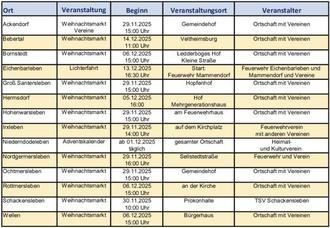Bei Redaktionsschluss lagen diese Termine für die vorweihnachtlichen Feste in den Ortschaften der Hohen Börde vor. Sollten weitere Höhepunkte in der Adventszeit geplant sein, bittet die Redaktion, diese Termine an schulz@hohe-boerde.de zu übermitteln. Wir werden diese Feste dann in der Dezember-Ausgabe (Erscheinungstag ist der 3. Dezember) veröffentlichen.