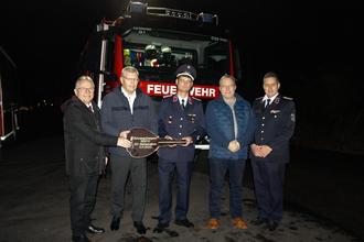 Im Beisein von Innenstaatssekretär Klaus Zimmermann (li.), Rottmerslebens Ortsbürgermeister Dominik Weitz (2. v. re.) und dem stellvertretenden Gemeindewehrleiter Thomas Hillmer (re.) überreichte Gemeindebürgermeister Andreas Burger (2. v. li.) den symbolischen Schlüssel für das Hilfeleistungslöschgruppenfahrzeug an Rottmerslebens Ortswehrleiter Thomas Brzezinski (Mi.).