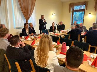 Staatsekretär Jürgen Ude (stehend) informierte während des Unternehmfrühstücks der Hohen Börde über den Stand und die Zukunft der Intel-Ansiedlung und die Herausforderung für Land und Kommunen.