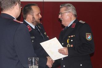 Gratulation für Horst Grothe (Hohenwarsleben): Für sein Engagement in der Alters- und Ehrenabteilung erhielt er den Ehrenstern des Landesfeuerwehrverbandes Sachsen-Anhalt. Fotos: Constanze Arendt-Nowak