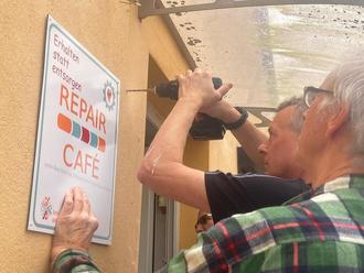 Matthias Mäde und Jürgen Sannemann bringen das Eingangsschild an der Tür zum Repaircafé an.