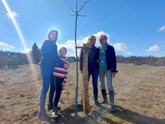 Anett, Mia, Jana und Gerlinde Besecke (von links) haben einen Baum für die Streuobstwiese im Hermsdorfer "Naschgarten" gespendet.