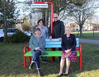 Die Stiftungsvorstandsmitglieder der „Stiftung Leben in der Hohen Börde“ Anke Busse (vorn, links), Steffi Trittel, Carola Pasemann (hinten, links) und Dr. Ernst Daencke präsentieren die Mitfahrbank, die vor dem Rathaus in Irxleben steht.