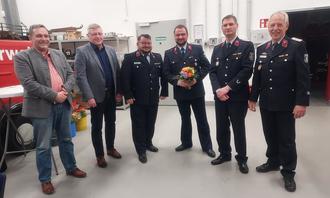 Thomas Ott (3. von rechts) wurde in seinem Amt als stellvertretender Ortswehrleiter bestätigt. Es gratulierten Ortsbürgermeister Dominik Weitz, Gemeindebürgermeister Andreas Burger, der stellvertretende Gemeindewehrleiter Marcel Herzberg, Ortswehrleiter Thomas Brzezinski sowie der stellvertretende Gemeindewehrleiter Volker Kramer (von links).