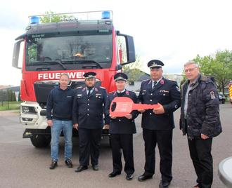 Als Gemeindebürgermeister Andreas Burger den symbolischen Fahrzeugschlüssel an Thomas Lüdemann und Matthias Jordan von der Ortswehrleitung übergab, gesellten sich auch Gemeindewehrleiter Stefan Libbe und Bebertals Ortsbürgermeister Torsten Schmidt (von rechts) dazu.