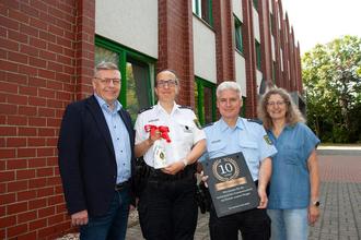 Bürgermeister Andreas Burger (links) und Hauptamtsleiterin Kerstin Pitschmann (rechts) überbringen den beiden Regionalbereichsbeamten Susanne Scharf und Jens Ruhnke Glückwünsche zum zehnjährigen Bestehen der Dienststelle in Irxleben.