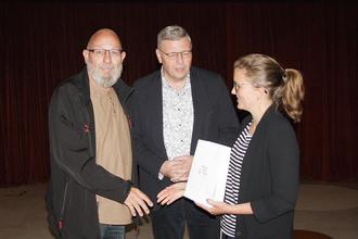 Ein Dankeschön hatte sich der Hohenwarsleber Thomas Brickzinsky (links) verdient, nachdem er die jungen Leute des Theater-Jugendcamps in Eichenbarleben beim Kulissenbau unterstützt hatte. Mit handwerklichem Geschick hatte er Platten zusammengeschraubt, denen die Teilnehmenden dann mit Farbe ein passendes Gesicht geben konnten. Gemeindebürgermeister Andreas Burger und Engagement-Koordinatorin Lisa Schulz sprachen den Dank aus.