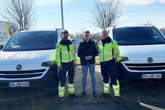 Mit neuen VW-Transportern sind seit Kurzem die Kita-Hausmeister der Gemeinde Hohe Börde, Christian Lübke (re.) und Andreas Hanusch (li.), unterwegs. Am Autohaus übernahmen sie die Leasingfahrzeuge vom Verkaufsberater Till Hentschel (Mi.). Die Fahrzeuge wurden wie die Vorgängermodelle mit Regalsystemen ausgestattet und sichern so ab, dass die Hausmeister ordnungsgemäß in ihrem Einzugsbereich von einer Kindereinrichtung zur anderen gelangen.