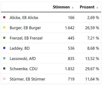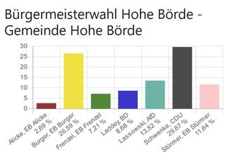 Bei der Bürgermeisterwahl in der Hohen Börde haben nach dem vorläufigen Wahlergebnis (Stand bei Redaktionsschluss des Mitteilungsblattes) Matthias Schwenke (CDU) mit 29,87 Prozent und der Einzelbewerber Andreas Burger mit 26,59 Prozent die meisten Stimmen der sieben angetretenen Kandidatinnen und Kandidaten erhalten. Da kein Kandidat die absolute Mehrheit erhalten hat, kommt es am Sonntag, 8. Oktober, zur Stichwahl zwischen Schwenke und Burger. Die Wahlbeteiligung lag bei 39,7 Prozent.