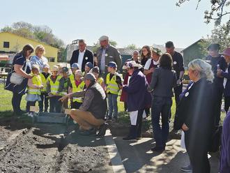 Ganz aufmerksam verfolgten die Kinder und die prominenten Gäste, wie die Pflanzkartoffeln die Erde kommen.