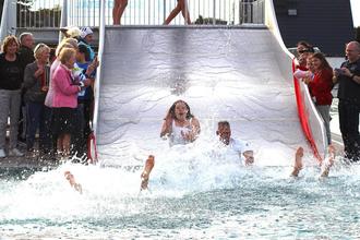 Unter Beifall rutschten die Ersten ins kühle Nass, darunter auch Niederndodeleber Ortschaftsräte.