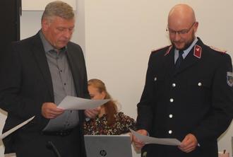 Kevin Pätz (rechts) ist neuer stellvertretender Ortswehrleiter in Hermsdorf. Seine Kameraden hatten ihn für die Führungsposition vorgeschlagen. Nach dem Beschluss durch den Gemeinderat der Gemeinde Hohe Börde nahm ihm Gemeindebürgermeister Andreas Burger den Amtseid ab und berief ihn somit für die Dauer von vier Jahren in das Ehrenbeamtenverhältnis.
