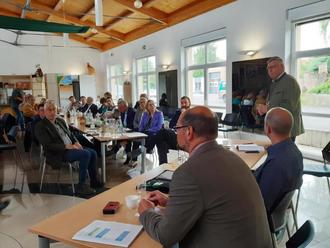 Aufmerksam hörten die Gäste beim Unternehmensfrühstück Landrat Martin Stichnoth (vorn) und Bürgermeister Andreas Burger (stehend) zu.
