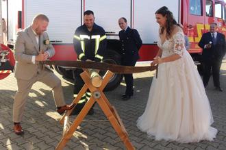 Nachdem sich Benjamin Tholotowsky und Isabelle Tholotowsky-Schunke auf der Veltheimsburg in Bebertal das Ja-Wort gegeben hatten, wurden sie zum Hermsdorfer Feuerwehrhaus gelotst, wo die Feuerwehrkameraden einige Überraschungen für sie vorbereitet hatten. Nach einem Gang über den Schlauchteppich und durch das Schlauchspalier durfte sich das Ehepaar – beide sind seit Jahren Mitglieder in der Hermsdorfer Feuerwehr – am Sägebock beweisen. Neben den Glückwünschen durfte auch das obligatorische Gruppenfoto mit den Kameraden nicht fehlen.