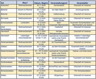 Weitere Informationen zu den Weihnachtsmärkten sowie weitere Adventsveranstaltungen finden Sie in den Rubriken der jeweiligen Ortschaften.