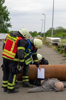 Im ersten Einsatzabschnitt wurde ein Unfall beim Verladen simuliert: Ein schweres Metallrohr war von einem Gabelstapler gestürzt und hatte eine Person unter sich eingeklemmt. Die Einsatzkräfte mussten das Rohr sichern, die Person patientengerecht befreien und eine Erstversorgung sicherstellen.