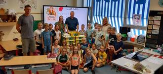 Bürgermeister Andreas Burger (Mitte) übergab digitale LEGO-Lernsysteme an die Grundschulen der Gemeinde Hohe Börde (hier Irxleben).