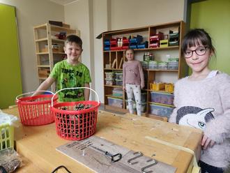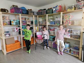 Oskar, Lisa und Melina zeigen einen der neuen Lagerräume. Dort sind beispielsweise Bastelutensilien, aber auch zusätzliches Mobiliar untergebracht.