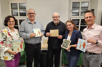 Bürgermeisterin Dorothee Obst, Mundart-Übersetzer Uwe Seltmann, Ulrich Knebel, Großneffe von Albert Sixtus, Anja Roocke und Stefan Czarnecki, Vorsitzender der LEADER-Region Zwickauer Land bei der Buchvorstellung von "De Hosenschul".