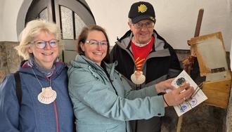 Zusammen mit ihrer Freundin Kerstin Kröckel ist Anja Roocke im Sommer durch Kirchberg gepilgert (Bild mitte). Die beiden haben eine Stempelstelle vermisst. Anja Roocke nahm sich der Sache an und stellte einige Wochen später mit Silke Riedel, die in Bad Schlema eine Stempelstelle hat, und Erhard Kühnel, Mitinitiator des Jakobweges, den Kirchberger Pilgerstempel offiziell vor.
