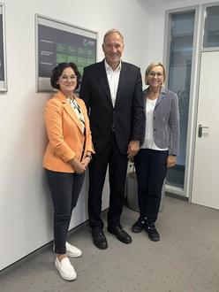 Bürgermeisterin Dorothee Obst mit der Konzern-Geschäftsführung von MAHLE: Arnd Franz und Jumana Al-Sibai.