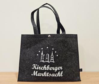 Schön, praktisch, nachhaltig: Die geräumige und robuste Kirchberg-Tasche in grau-schwarz ist ein idealer Einkaufsbegleiter und zeitgleich ein Bekenntnis zu unserer schönen Stadt. Sie ist nicht nur hübsch anzusehen und praktisch, sondern punktet auch in Sachen Nachhaltigkeit. Denn gefertigt wurde sie aus recycelten PET-Flaschen und Stoffresten. Sie besitzt zwei große Henkel und kann mit einem Druckknopf verschlossen werden. Neben dem weißen Schriftzug „Kirchberger Marktsackl“ - ein Name, der den Nutzen gleich perfekt beschreibt - ist auch das moderne Kirchberg-Logo mit den drei Türmen abgebildet. Die Tasche misst 45 x 33 x 13 Zentimeter.