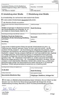 Die Absicht der Umstufung der genannten Straße liegt ab 01.05.2024 für die Dauer von 3 Monaten, also in der Zeit vom 01.05.2024 bis zum 31.07.2024 während den Öffnungszeiten in der Stadt Kirchberg, Bauamt, Neumarkt 2 in 08107 Kirchberg zur öffentlichen Einsicht aus.