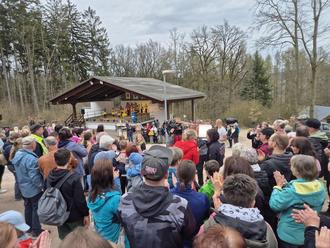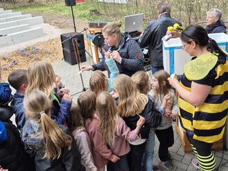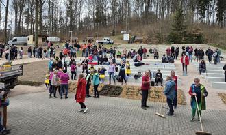 Abschlussbild mit Moderatorin Gesine Schöps, Bürgermeisterin Dorothee Obst und einigen Besuchern und Helfern unseres MDR Frühlingserwachsens!