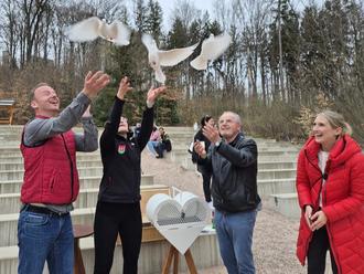 Jürgen Wutzler ließ mit Bürgermeisterin Dorothee Obst und dem MDR-Team Tauben in die Luft steigen als Zeichen für einen guten Neustart an der Freilichtbühne.