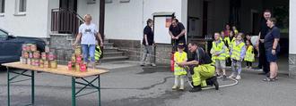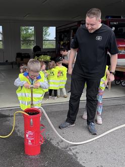 Doch da bauten sie schon die nächste Überraschung für uns auf! Dosenschießen! Aber wie sich das für waschechte Feuerwehrleute gehört, natürlich nicht mit dem Ball, sondern mit einem Strahlrohr und viiieeel Wasser aus der Kübelspritze! Die Dosen damit zu treffen war gar nicht so einfach. Aber schließlich haben wir sie alle zu Boden gebracht! Das Pumpen haben wir den starken Männern überlassen. Trotzdem haben einige Kinder ihre Kraft sowie ihre Ausdauer testen wollen und probierten sich beim eigenen Pumpen aus. Das hat uns so viel Spaß gemacht, dass wir alle gar nicht aufhören wollten.