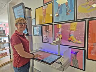 Sindy Krause zeigt die einfache Bedienung des Gesundheitsterminals.