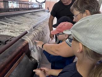Es wurde uns gezeigt, wie: 1. die Wolle gelagert, 2. sie verfeinert und zu Bündeln verarbeitet, 3. sie aufgewickelt und 4. schließlich eingefärbt oder für die Weiterverarbeitung zu Kleidungsstücken vorbereitet wird. Außerdem wurden für uns die historischen, großen Maschinen angeworfen. So wurde für uns alles lebendig.