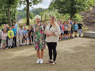 Zur Begrüßung der Erstklässler auf dem Schulhof, stellte Schulleiterin Heike Schubert auch eine neue Kollegin vor: Frau Cindy Scheller wird das Lehrer-Team und die Schülerinnen und Schüler der Kirchberger Grundschule als Schulassistentin tatkräftig unterstützen.