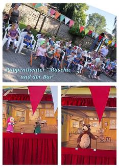 Zum Abschluss der Ferienzeit besuchte uns noch ein Puppentheater mit der Geschichte „ Mascha und der Bär“. Bei schönem Wetter wurde die Bühne auf unserer Freifläche aufgebaut und alle Kinder verfolgten gespannt die Darbietung der Geschichte mit den Handpuppen. Viele Kinder berichteten auf dem Heimweg ihren Eltern von den spannenden Ereignissen des Tages.
