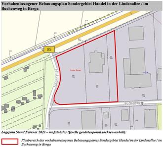 Für den im Lageplan Stand Februar 2023 dargestellten Bereich östlich der Ortslage von Berga, im Bebauungsplangebiet des Gewerbegebietes, zwischen Buchenweg, Lindenallee und Sangerhäuser Straße gelegen, wird nach § 12 BauGB i.V.m. § 2 Abs. 1 BauGB ein vorhabenbezogener Bebauungsplan mit Vorhaben- und Erschließungsplan für ein Sondergebiet Handel aufgestellt. Der Vorhaben- und Erschließungsplan wird vom Vorhabenträger,