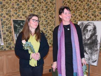 Die Künstlerinnen Andrea Ackermann und Susanne Theumer bei der Eröffnung der Ausstellung „Frauen und Landschaften der Reformation - Eine Hommage“ am 25. April 2025. Die Werke der beiden Malerinnen zusammen mit der Wanderausstellung „Frauen der Reformation“ können noch bis zum 21. Juni im Schloss Stolberg besichtigt werden.