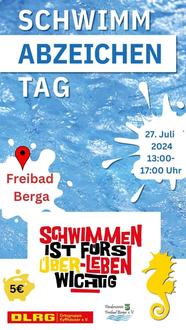 Der Förderverein des Freibades Berga lädt zum 2. Abzeichentag ein. Bitte meldet euch an der Kasse im Freibad vorher an.