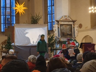 In diesem Jahr fand der Weihnachtsmarkt um die Kemberger Kirche statt. Alle Programmpunkte wurden in der Kirche vorgetragen. Unter anderem auch unser Theaterstück: „Der Grinch“. Mit Hilfe eines Schattentheaters konnte man sich die Geschichte vom bösen Grinch, der kein Weihnachten mochte und dann aber durch die liebe Cindy Lou doch noch ein Herz bekam, anschauen.