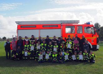 Alle Kinder haben diese Leistungsschau mit Bravour bestanden und konnten am Mittag stolz Ihre Urkunden in Empfang nehmen. Zum Abschluss zeigten alle Kinder in einer Gruppenübung noch das richtige Vorgehen beim Löschangriff „nass“.