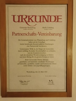 In den 80er Jahren besuchten die Colmberger wieder Wartenburg. Ilse Stamminger, die mit ihren Eltern bei den Sillers lebte und dort aufgewachsen war und nun mit Hans Stamminger verheiratet war, kam zum ersten Mal mit nach Wartenburg. Gemeinsam mit Karin und Wolfgang Siegel, Marga und Irmgard, lernten sie Wartenburg, die Vereine und das Dorfleben immer näher kennen und lieben. Hans Stamminger, der schon zu dieser Zeit aktiv im Vereinsleben in Colmberg tätig war, war von unserem kleinen Elbedörfchen ganz begeistert. Er knüpfte Kontakt zum Gemeindevorstand von Wartenburg und schlug eine partnerschaftliche Verbindung vor. Die Bürgermeister beider Ortschaften besuchten sich nun und merkten gleich, dass die Verbindung von Akzeptanz und herzlicher Anteilnahme geprägt war. Endlich war der denkwürdige Tag da! Am 28. März 1992 unterschrieben Rolf Klopotowski, der damalige Ortsbürgermeister aus Wartenburg und Hans Nölp, 1. Bürgermeister der Marktgemeinde Colmberg eine Partnerschaftsvereinbarung.