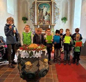 Vielen Dank an alle Helfer und Unterstützer! Dann ging es auf zur Bergwitzer Kirche. Viele Kinder kannten die Kirche in ihrem Heimatort noch nicht. So war es sehr interessant für sie, hier einiges Neues über die Tradition des Erntedankes und über das Gotteshaus zu erfahren und die Projektergebnisse zu präsentieren.
