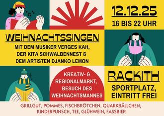 Am Freitag, den 12. Dezember 2025, verwandelt sich der Rackither Sportplatz in ein festlich geschmücktes Weihnachtsareal für die ganze Familie. Zwischen 16:00 und 22:00 Uhr sind Groß und Klein herzlich eingeladen zum „Weihnachtssingen“ – bei freiem Eintritt.