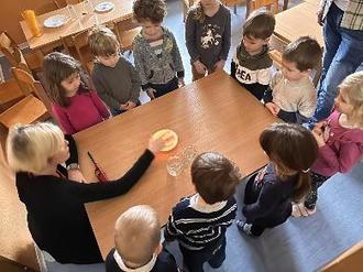 „Die Zauberhafte Welt der Experimente“ gab unserem Thema „Experimente durchführen und verstehen“ einen wunderbaren Leitfaden. So beschäftigten wir uns in der Kita intensiv mit Wasser, Luft, Feuer und Erde. Es wurde gesungen, gereimt und fleißig experimentiert. Einigen Geschichten wurde gelauscht. „Märchen vom Erdwichtel“, „Märchen vom Feuervogel“, „Märchen der Muschelprinzessin“ und dem „Märchen von der Pusteblume“. Die Geschichten der „Elementchen“ wurde erzählt und ausprobiert. Pflänzchen, Wölkchen, Tröpfchen und Fünkchen begleiteten uns jeden Tag. Unsere Experimente waren: Kerzenexperiment – wann brennt die Kerze und wann nicht? Kann eine Kerze schwimmen? Warum färbt sich Sellerie, wenn man es in buntes Wasser stellt? Was schwimmt und was schwimmt nicht? Erfühlen wir verschiedene Gegenstände? Wie bekomme ich das Ei in die Flasche? „Sternexperiment mit Zahnstochern.“ „Wachsende Würmer.“ Unsere Gedanken drehten sich um Wissenschaft, Bewegung und Entspannung, Musik, Kreativität, Natur und Umwelt, Sprache, Gemeinschaft und Rezepte. In unserer Bewegungslandschaft stellten wir eine Wasserwelt dar und bewegten uns darin. Wir spielten Feuer, Wasser, Sturm und Sand. Die Bewegungsgeschichte „Feuer“ lockte uns aus dem Haus. Zahlreiche wundersame Dinge passierten und alle waren sehr gespannt. Zur Entspannung gab es eine Meditationsgeschichte unter Wasser. Die Erde zeigte uns Fenster und Türen um kreative Bilder zu legen.