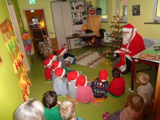Ho, ho, ho ertönte eine tiefe Stimme … und es klopfte an der Tür. Der Weihnachtsmann wurde von uns herzlich mit Gesang begrüßt. Alle Kinder staunten und waren ganz aufgeregt. Es wurden Gedichte aufgesagt und zur Stärkung bekam der Weihnachtsmann Plätzchen überreicht. Anschließend gab es für alle Kinder die Geschenke und nach dem auspacken viele leuchtende Kinderaugen.
