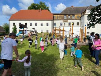 Gott sei Dank, sie ist nach langer Wartezeit endlich eröffnet - bei schönstem Sonnenschein: die „Bewegungs- & Lernspielstätte Planetenspielplatz“ im Dorfzentrum von Radis.