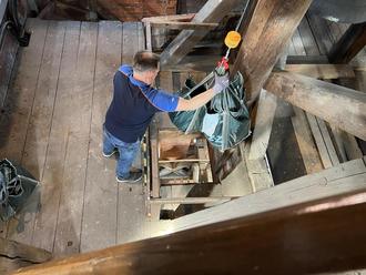 In Arbeitssachen, mit Mundschutz und Kehrutensilien bewaffnet ging es nach kurzer Unfallschutzbelehrung teilweise hoch hinaus. Zwischen der Türmerwohnung und bis knapp unter die Kirchturmspitze wurde alles zusammengekehrt, was nicht in einen Kirchturm gehört. Kleine Bäumchen, die beim Geländer der Fialen wuchsen, tote Tauben und Fliegen wurden in über 30 Müllsäcke geladen und mit Hilfe einer Seilwinde über 40 Meter nach unten gebracht. Die Helfer konnten sich im 86 Meter hohen Turm gut aufteilen, was dazu beigetragen hat, dass der Arbeitseinsatz nach rund zwei Stunden erledigt war. Eine Reinigung des Kirchturms ist zeitaufwendig, da teilweise sehr weite Wege zurückgelegt werden müssen.