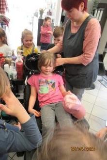 Im Friseursalon Ambiente beobachteten wir Emils Mama beim Haare schneiden und konnten sogar selber beim Haare waschen Hand anlegen. Am coolsten war aber, dass jedes Kind eine farbige Haarsträhne bekam.