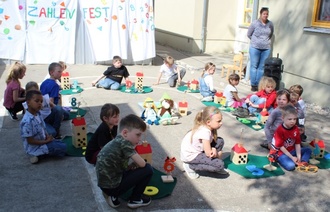 Die Vorschulkinder reisten regelmäßig ins Zahlenland, um mit seiner Zahlenstadt, ihren Bewohnern, dem Zahlenkobold Kuddelmuddel und der Fee Vergissmeinnicht die Zahlen von 1-10 kennen zu lernen. Anschließend gab es passend dazu ein Zahlenlandfest, bei dem alle Eltern eingeladen wurden. Alle Kinder waren sehr aufgeregt, weil wir ein kleines Programm mit Liedern, Gedichten und Abzählreimen einstudiertet hatten. Jedes Kind präsentierte eine Zahl und erhielt am Ende eine Urkunde. Bei Kaffee und Kuchen ließen wir den Nachmittag ausklingen.