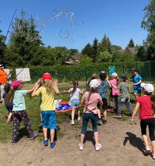Zum Kindertag besuchte uns ein Seifenblasenartist. Nach einer kurzen Vorführung duften sich alle Kinder selbst ausprobieren und große Seifenblasen herstellen. Die schwebenden Seifenblasen glänzten in der Sonne und waren schön anzusehen. Dies erfreute Groß und Klein.