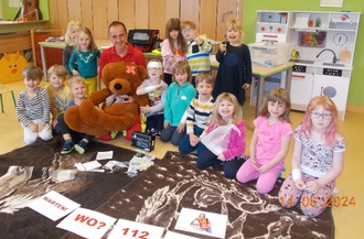 Am 14.06.2024 war es endlich soweit Herr Seifert vom DRK kam zu uns in den Kindergarten. „Was macht der Mann denn nun mit uns?“ Mit viel Spaß, aber auch mit der nötigen Ernsthaftigkeit, wurden den Kindern die Grundlagen der Ersten Hilfe vermittelt.